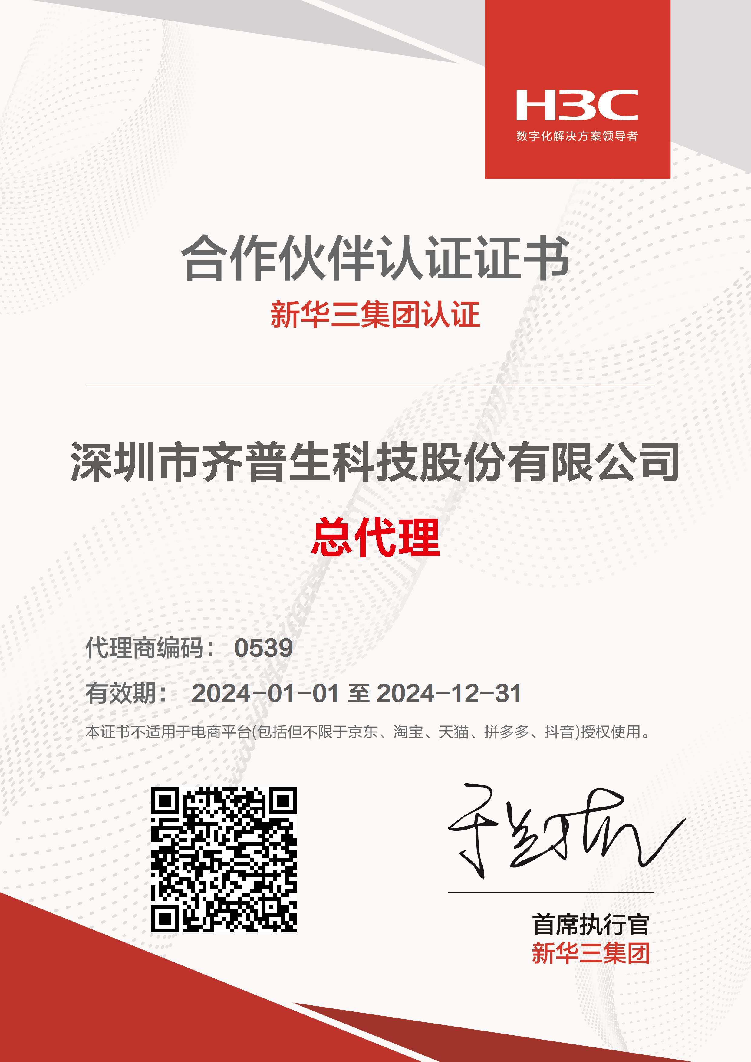 • 2024年H3C總代證書(shū)