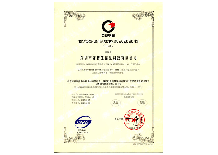 • ISO/IEC 27001信息安全管理體系認證證書